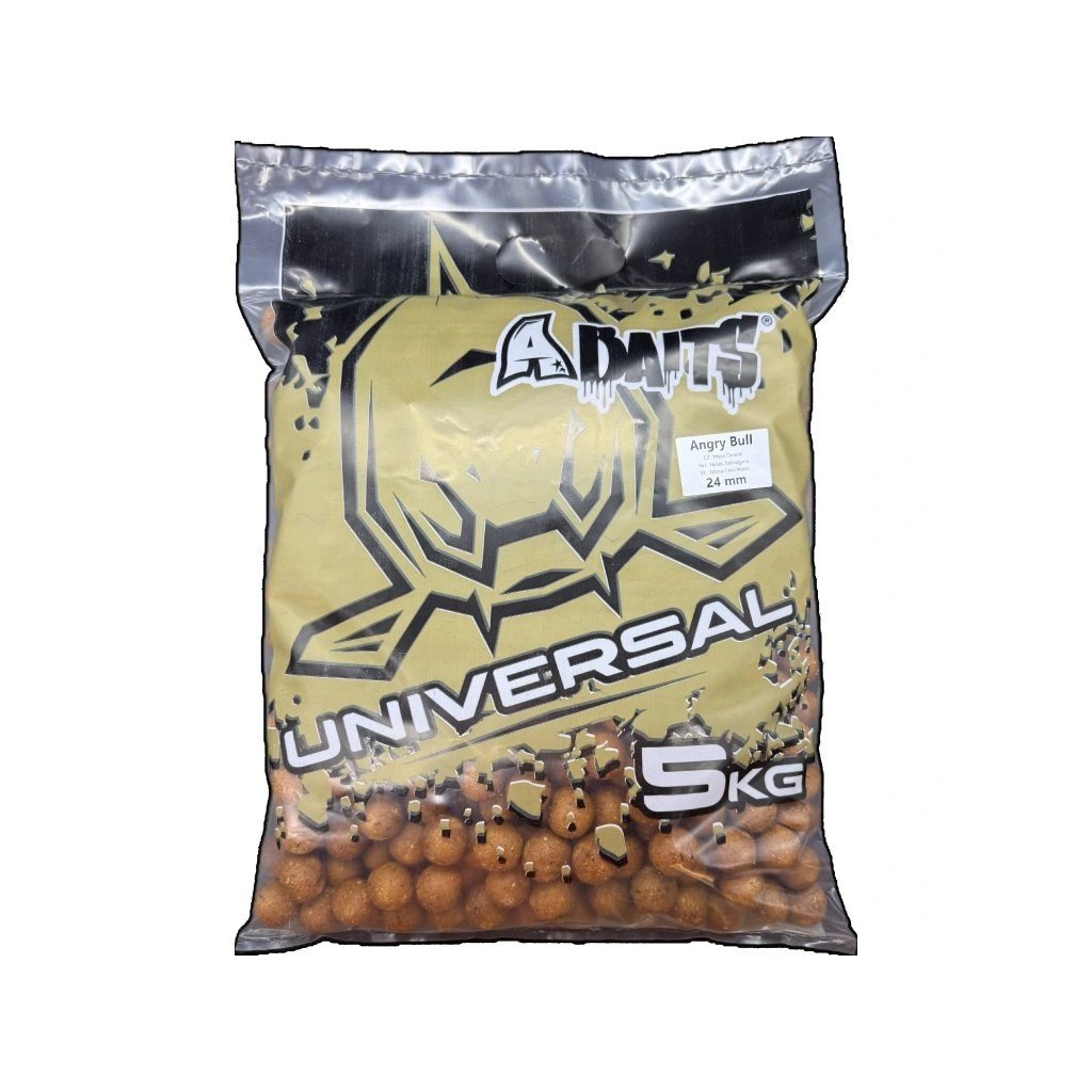 Boilies Universal Angry Bull spojuje ověřený základ řady Universal s přídavkem výrazných masových a pálivých složek. Základem směsi je 50 % objemová směs Niger a 50 % sušených proteinových složek doplněných o čerstvá vejce. Tato kombinace zajišťuje vysokou nutriční hodnotu a snadnou stravitelnost pro kapry v každé roční době.