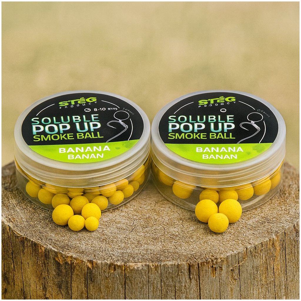 Soluble Pop Up Banana je výrazně voňavé plovoucí rozpustné boilies, které po vhození do vody začíná okamžitě pracovat. Uvolňuje intenzivní banánové aroma a jemný žlutý kouřový efekt, díky kterému nástraha přitahuje kapry na řekách, pískovnách i přehradách po celém Česku a Slovensku.